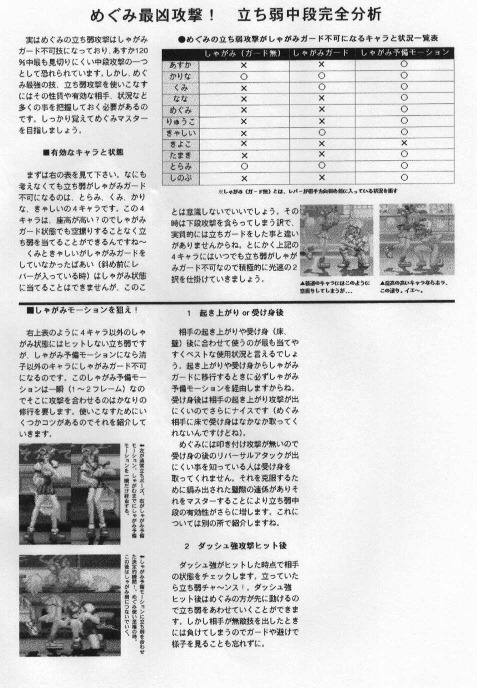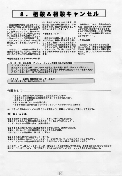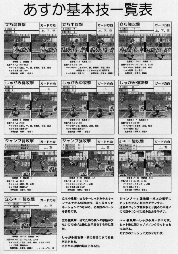 あすか120%スペシャル Ver.1と2の見分け方 <一時限目> メガファイトトーナメント 出場者データ データの見かた 技データ あすか〜しのぶ <二時限目> あすか120%スペシャル システム基礎 <三時限目> 対戦攻略基礎 <四時限目> キャラ別対戦攻略 <五時限目> マニアのためのシステム解析(前編) マニアのためのシステム解析(後編) <六時限目> 後書き <読み物> あすか120%の歴史 あすか120%の血統格闘ゲーム 隠しコマンドと改造コードなど <データ一覧表> 基本攻撃値一覧 キャンセル可能時間一覧